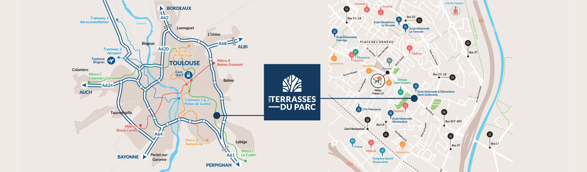 La résidence s’épanouit en bordure du parc Alalouf, écrin de verdure propice à la détente. À seulement 300 mètres, la future station de métro « L’Ormeau » permettra de rejoindre le centre-ville en trois stations et la gare Matabiau en moins de quinze minutes. Bien connectée, la résidence profite aussi d’un accès rapide à la rocade, à moins de 750 mètres, facilitant tous les déplacements dans l’agglomération.